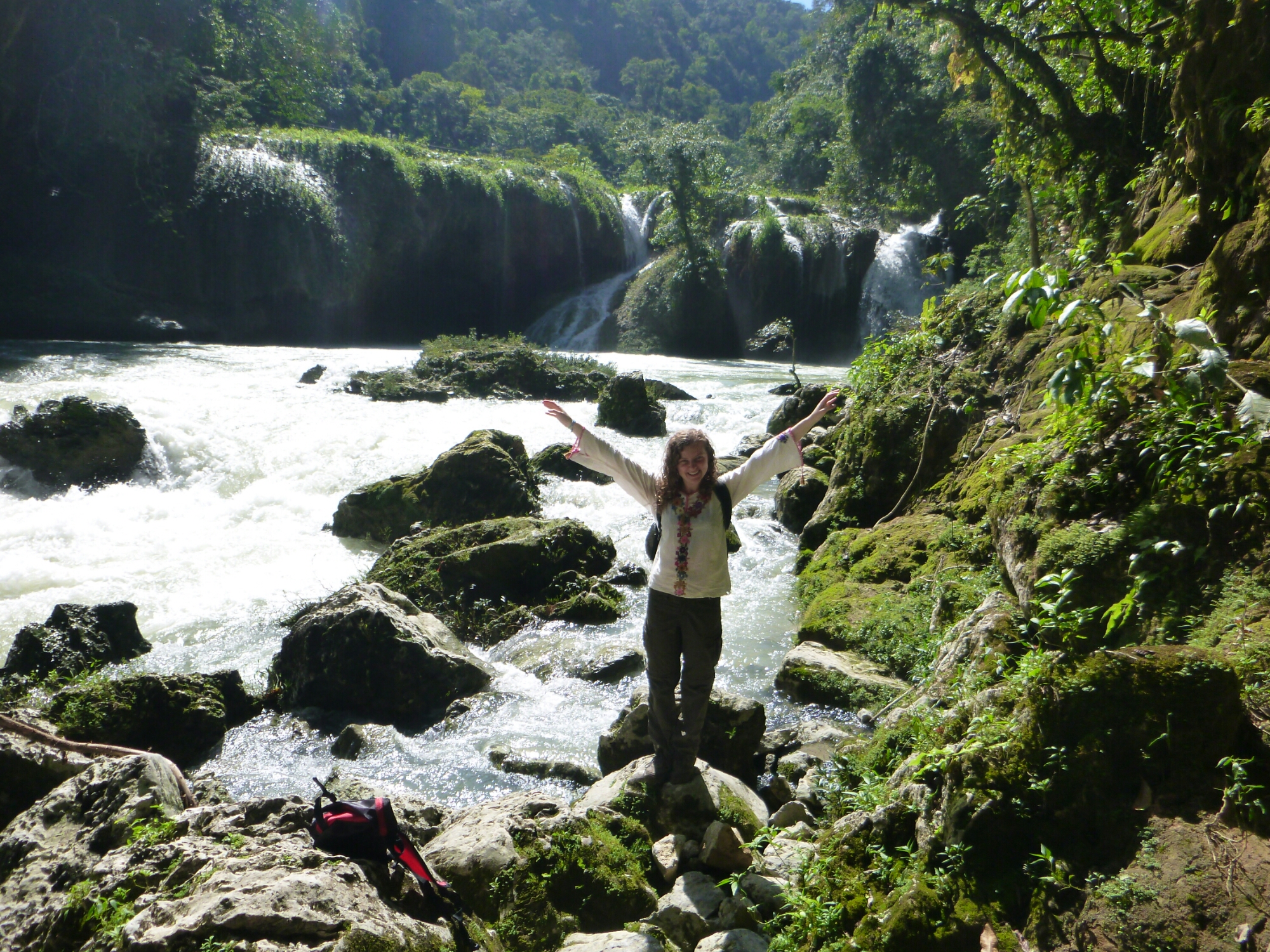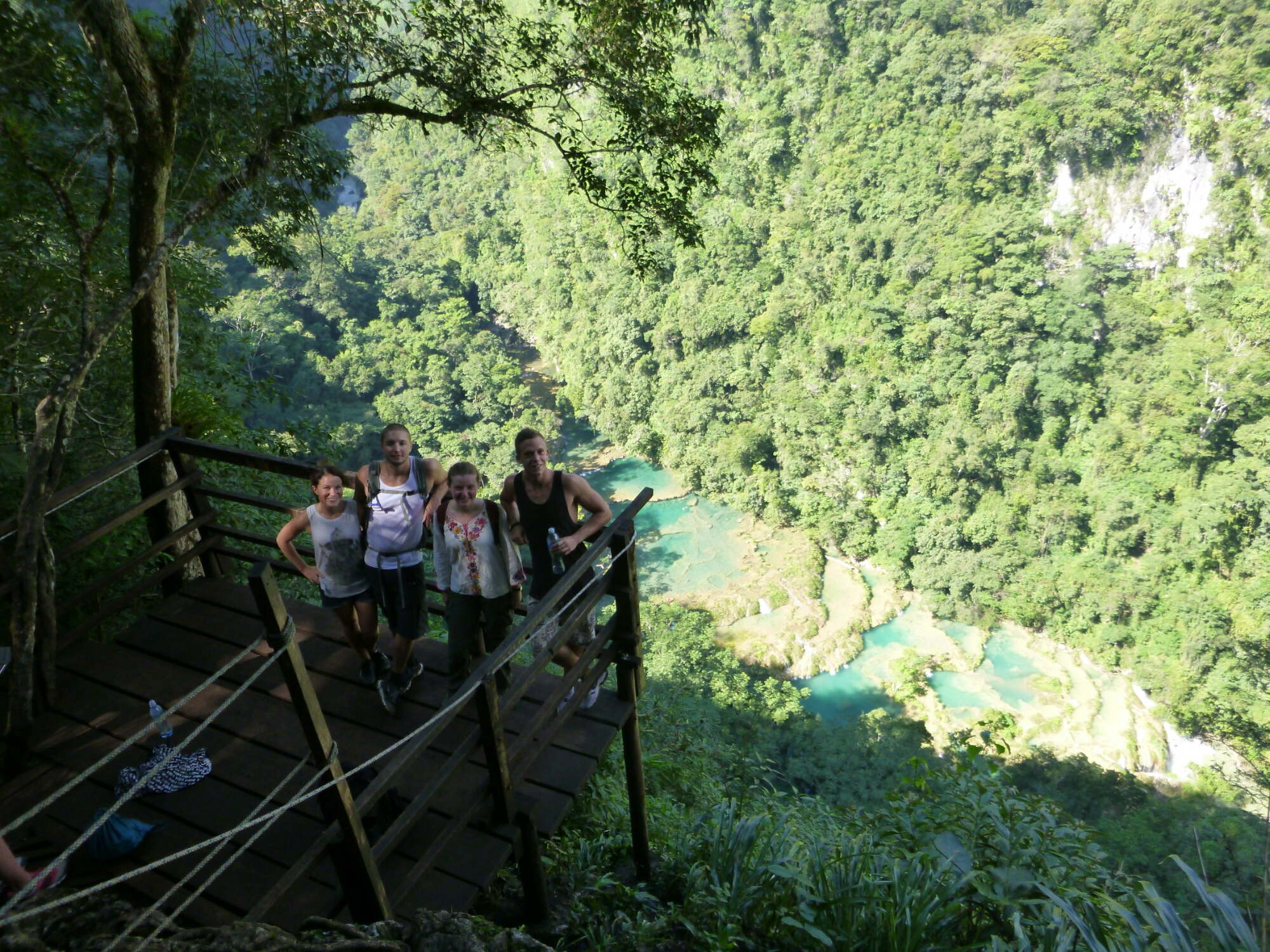 A while later we entered the national park, where we climbed up many slippery, stone, stairs in the forested jungle to reach a mirador (viewpoint). From here we could see a magnificent series of pools and waterfalls along the river. The water was so crystal clear that I could see the rocks on the river bed. Looking closely at the fresh, blue, clam water I could see white water gushing down from from one large pool to the next. This magnificent water system was surrounded by the vast forested mountains which spanned on for what seemed an eternity. I glanced in the distance and saw evidence of deforestation, patches of forest had been cleared for farming. This saddened me and the situation with the Guatemalan citizens did not seem to have benefited from this farming – still people appeared to be suffering.
