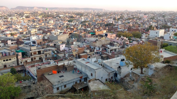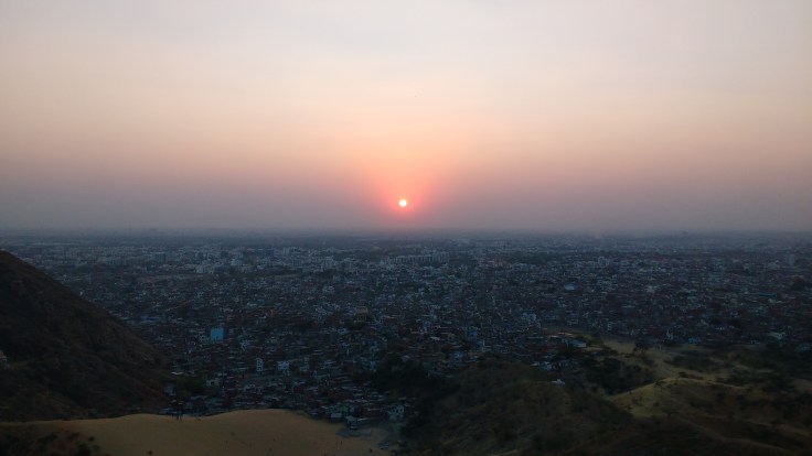 On mounting the top, we climbed a wall to watch the sun sink over Jaipur city. Nearby there was a huge sand dune that kids were running down. I could see houses packed together in the city.