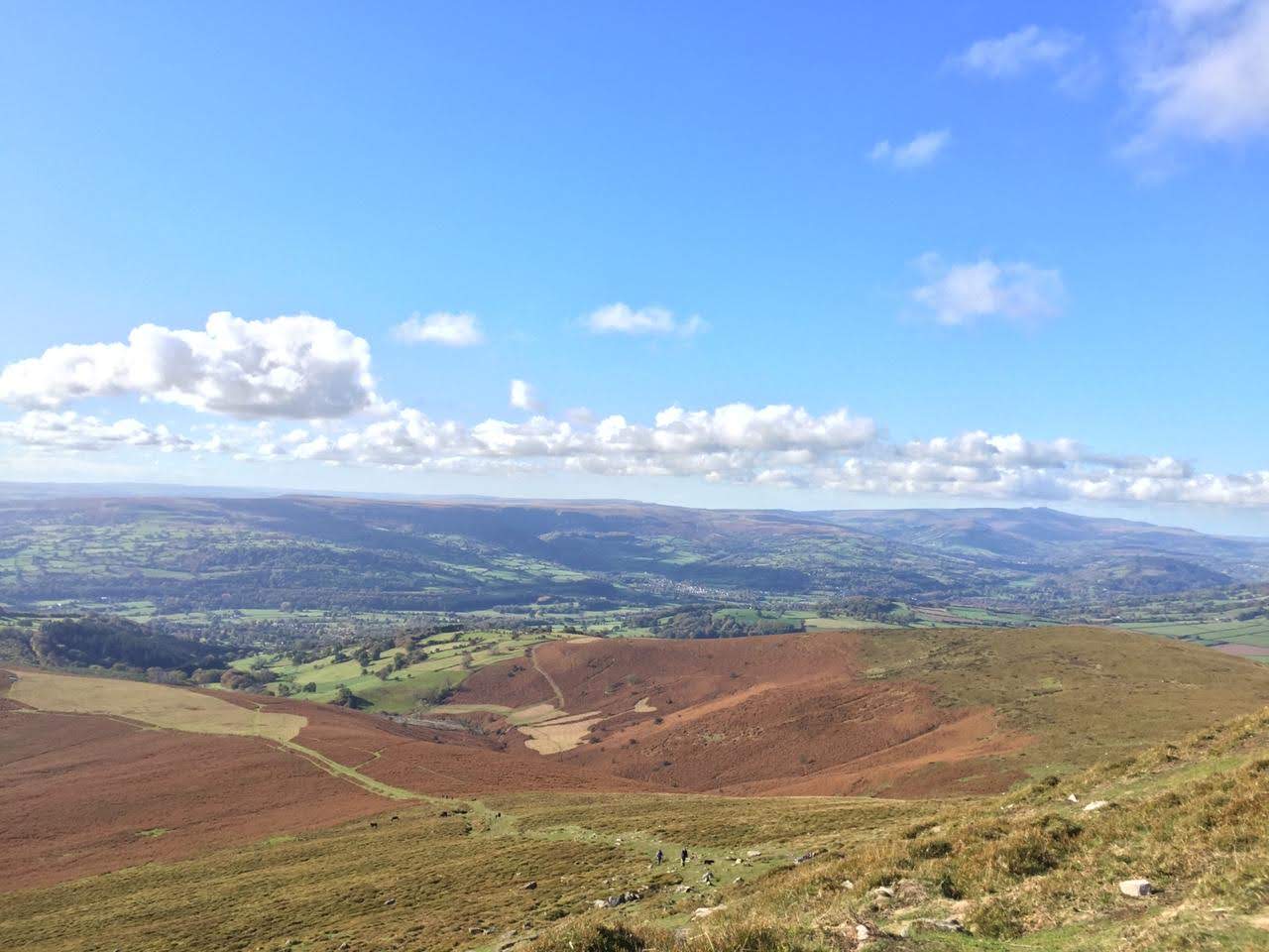 The cold wind hit my cheeks making them rosy red. We could see across the Brecon Beacons; green hills rolled in front of us, while small settlements dotted the horizon with white and grey specks. In the far distance a lake could just about be made out. Its dull blue blended in with the sky. We were extremely lucky because the sun was out. After walking only 10 minutes our bodies warmed up, despite the low temperatures.
