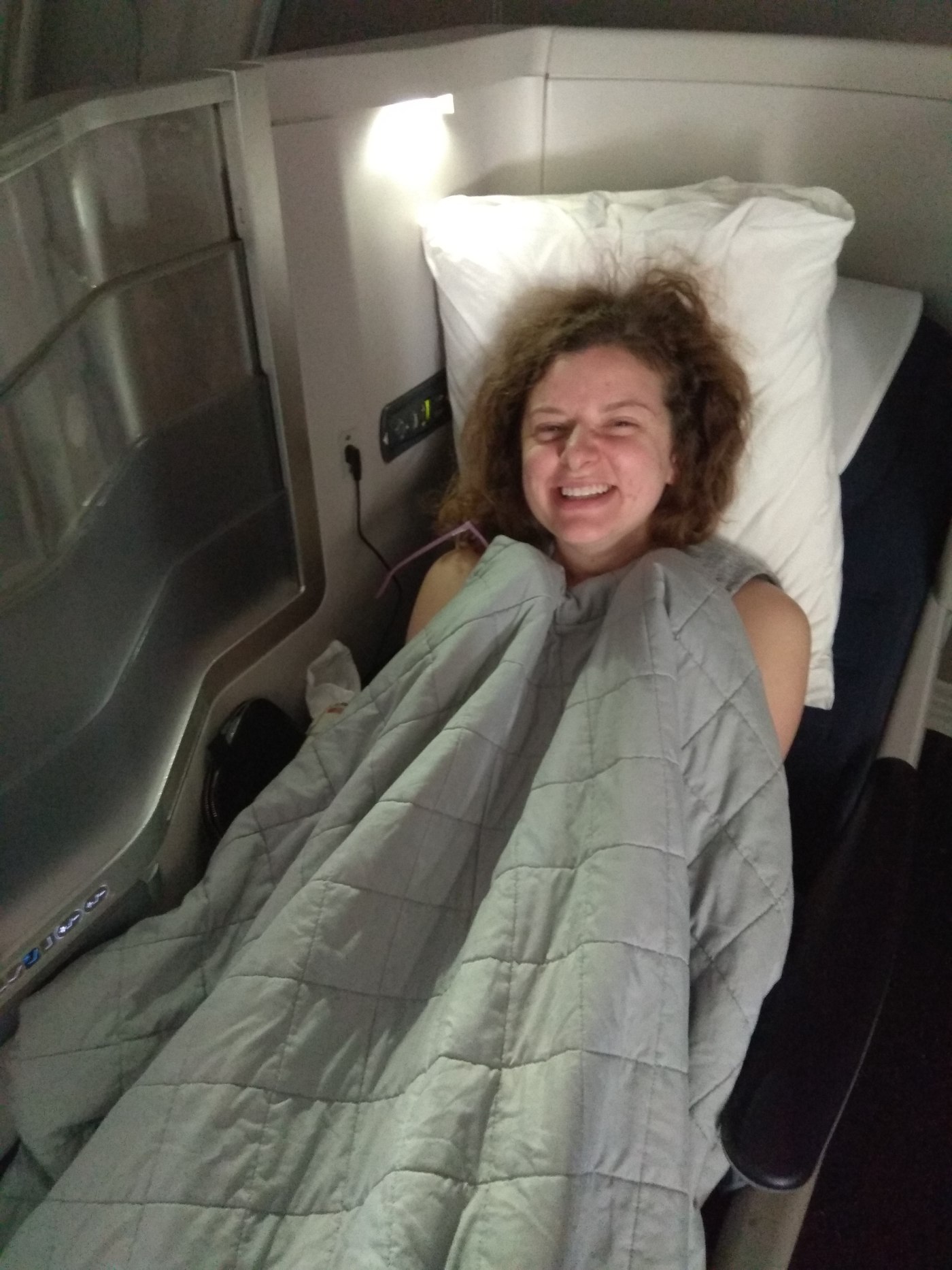 Feeling satisfied from dinner I pressed a button on my chair which made it into a bed. As soon as I put the eye mask on and my head landed on the comfortable pillow I fell asleep.