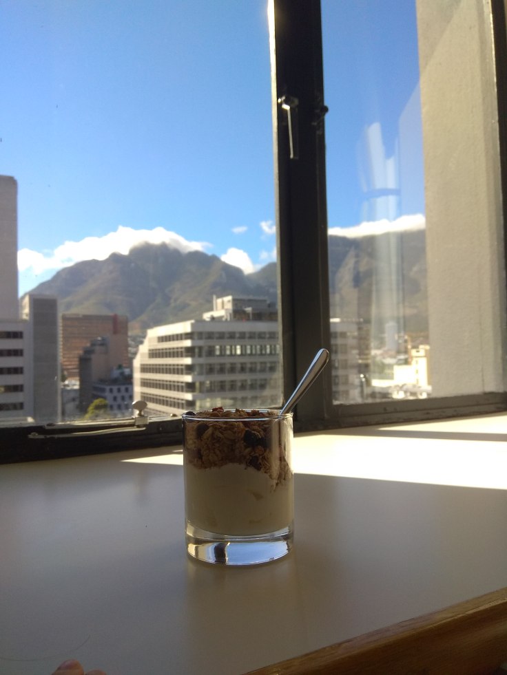 Enjoying yoghurt and granola in our hotel room in front of Table Mountain we gained the fuel we needed to set off.