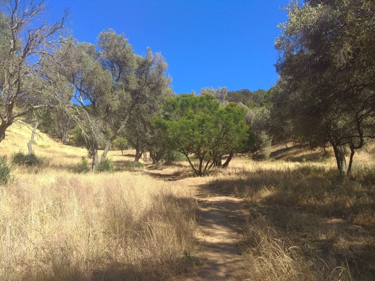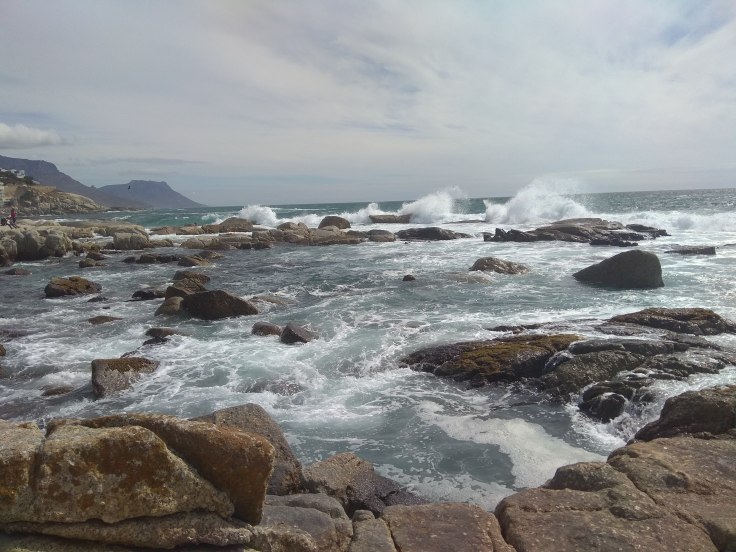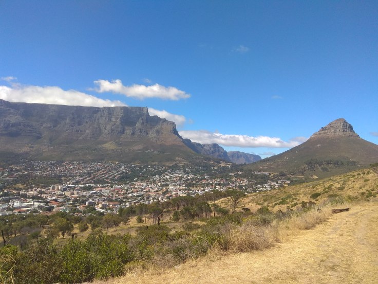 The path was arid, we ventured through yellow grassland, with several trees lining the way. The views were wonderful. To our right rugged mountains jutted out into the sky. Table Mountain with its notorious flat top dominated the skyline. In the valley a littering of settlements glistened in the sunlight. Red brick roofs huddled together, while skyscrapers stood tall. Turquoise swimming pools were spotted all over town. The Atlantic Ocean sat to our left spanning miles.