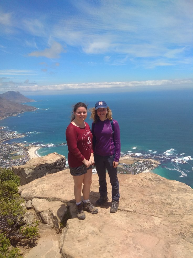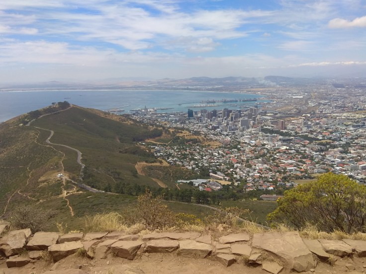 I was trying not to think about getting down after, for now we just wanted to reach the end of the trail. This turned out to be the top of the mountain. The view was certainly worth the climb. I could see Cape Town’s Bay to my left. Its semicircle of sand contrasted the dark blue sea. Industrial shipping containers formed white rectangles while mountain ranges stood out on our right.