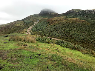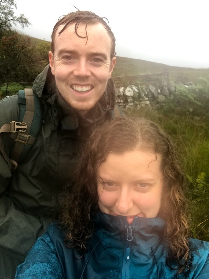 At 9ish it was time to put our waterproofs on and brave the elements. To get back onto the trail we walked up a tarmac road across a massive hill. We were following a hiker with his small dog in front. He turned around to ask us if he was going the right way.