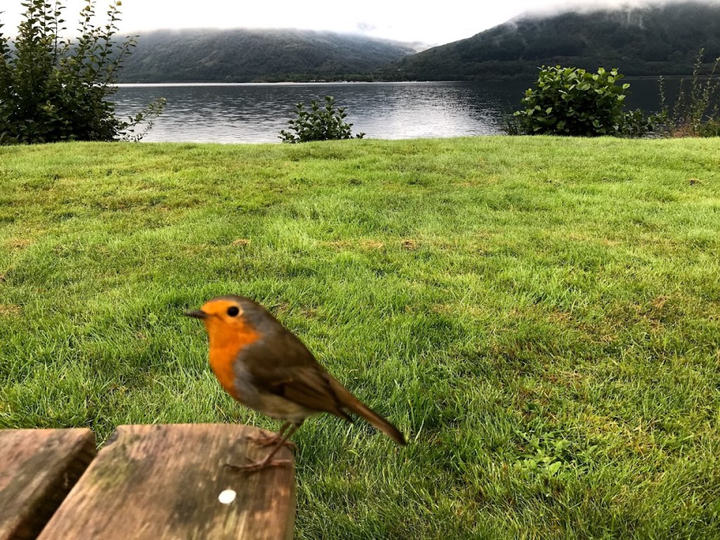 On day 3 Rowardennan to Inversnan 23km, we enjoyed our breakfast on the loch in the company of a robin and thousands of midges. The hostel packed us some goodies to fuel us for the day.